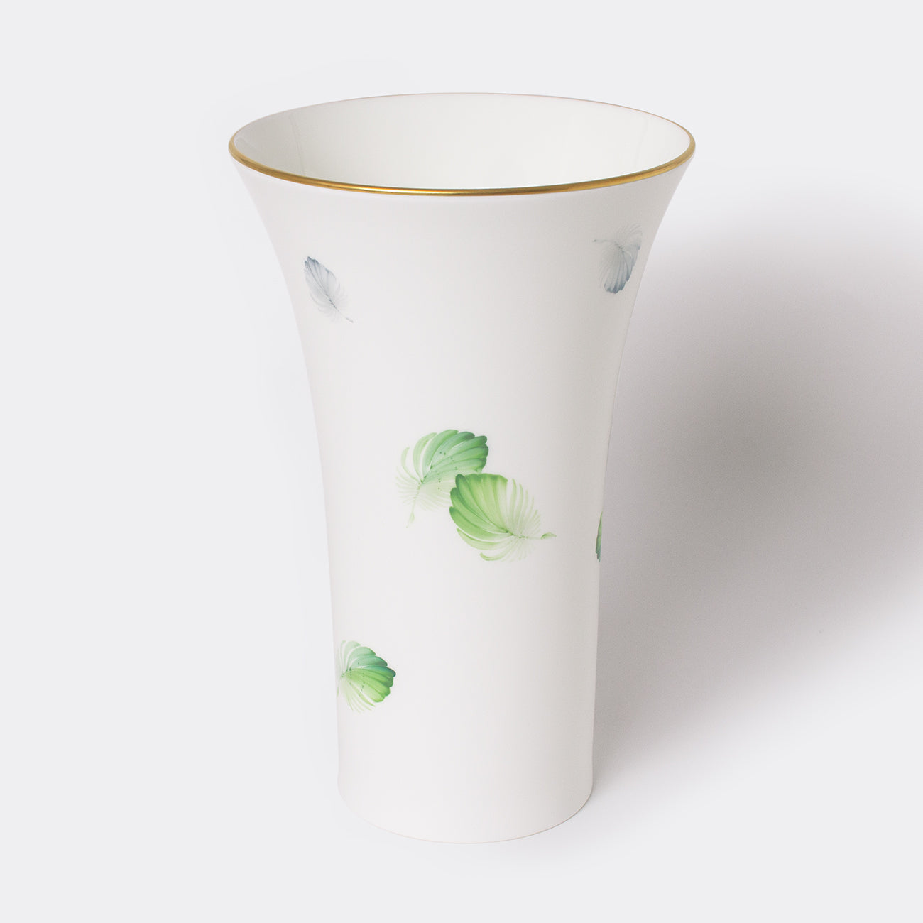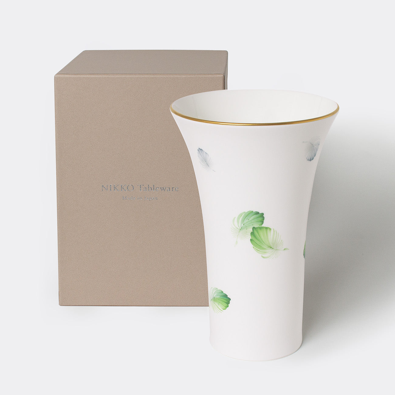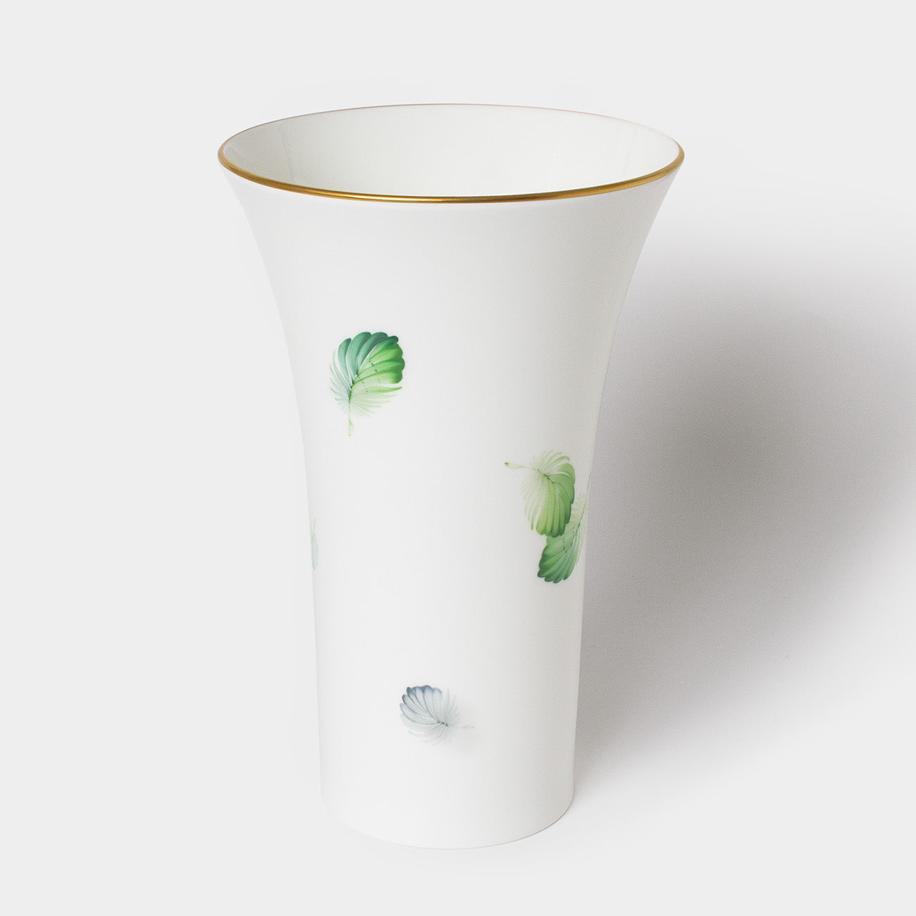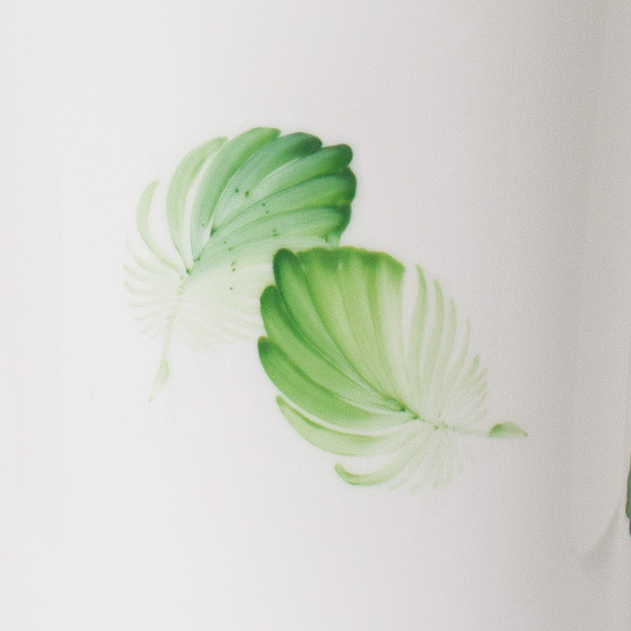 森の植物や生き物、空気感を描く「MORI 森」シリーズ。幸運をもたらすといわれるラッキーモチーフの「羽」を森の緑を思わせる優しい色合いで描いたフラワーベースです。