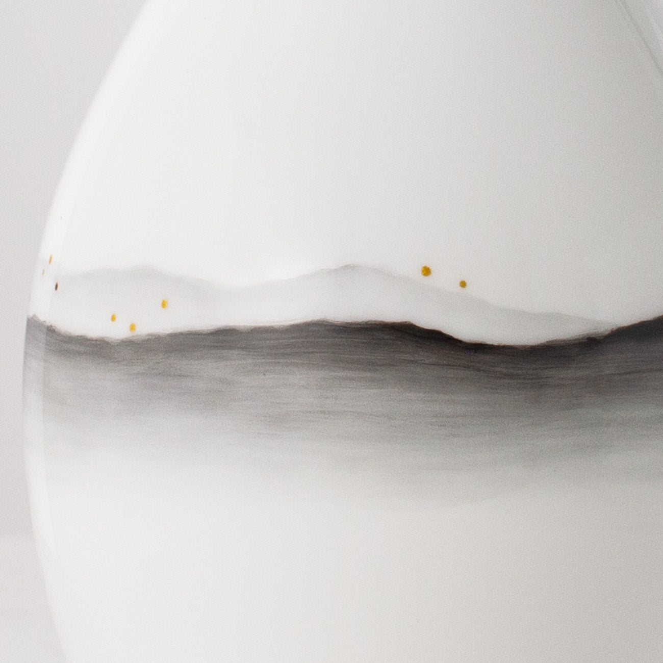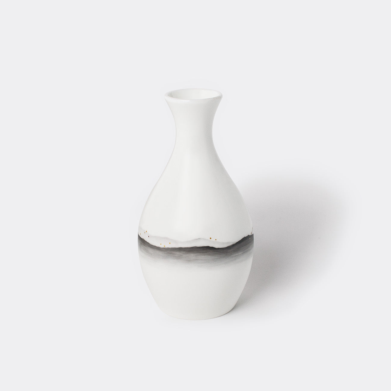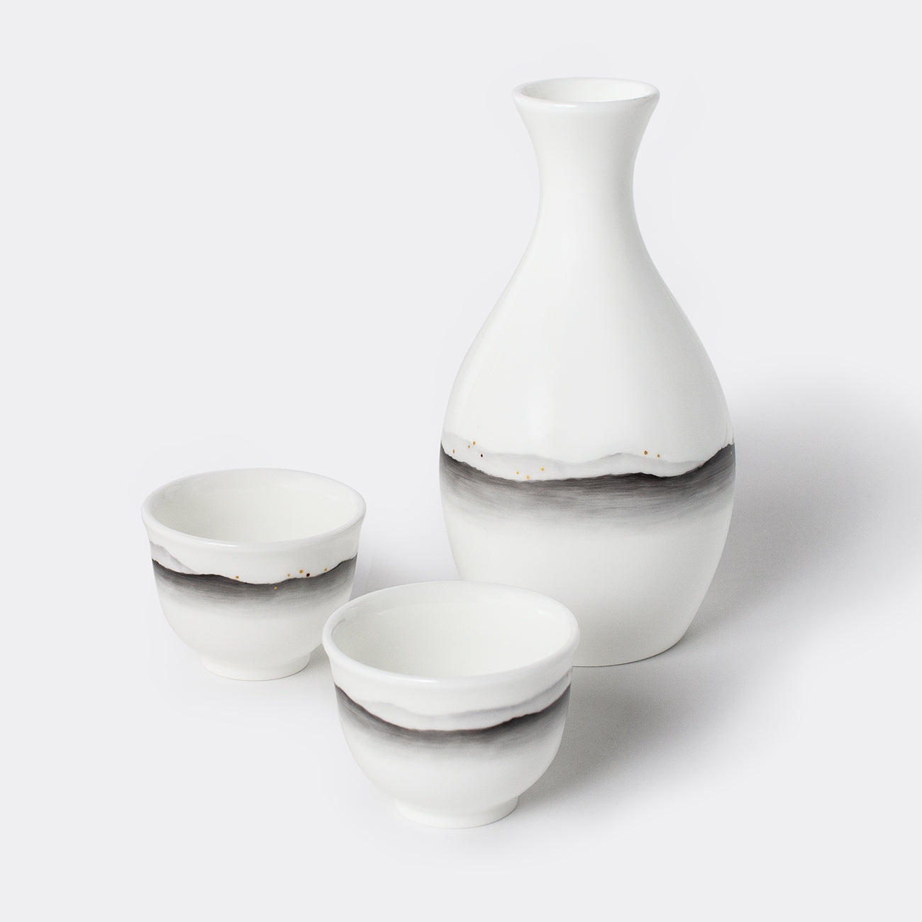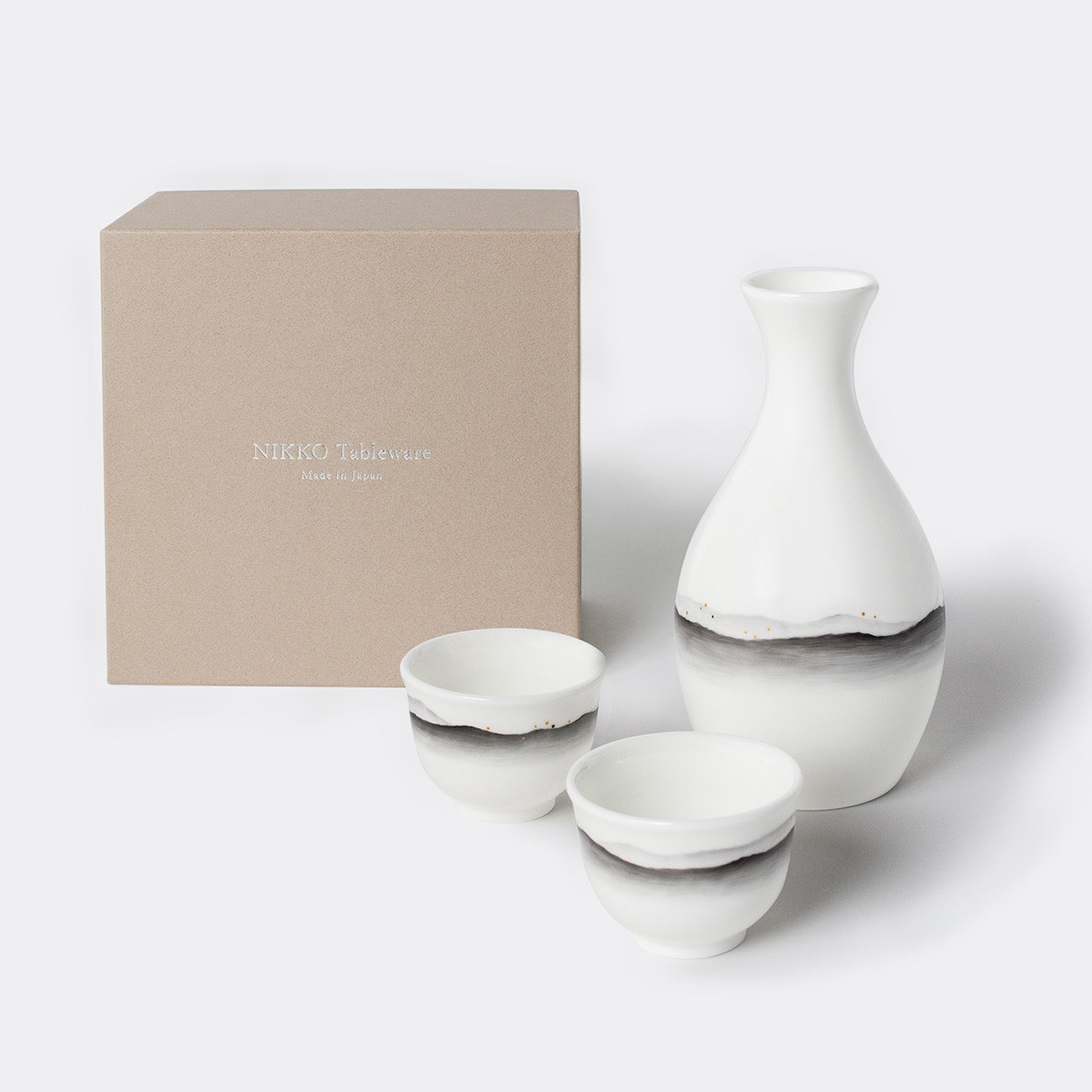 北陸の自然をテーマに墨絵調で描いた酒器セット「山ぎわ」はしっとりと落ち着いた中にモダンな雰囲気を感じさせる器です。大切な方への贈り物にもおすすめです。セット内容: