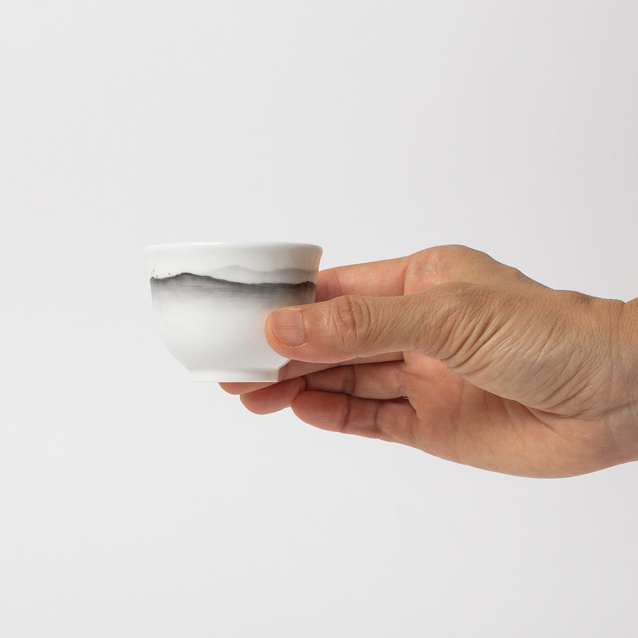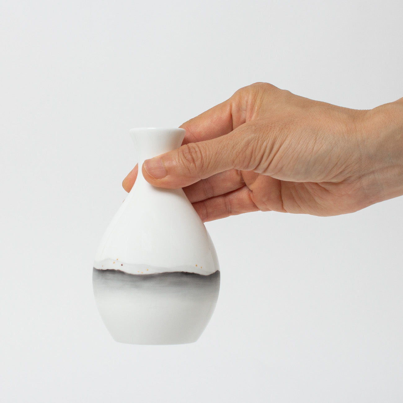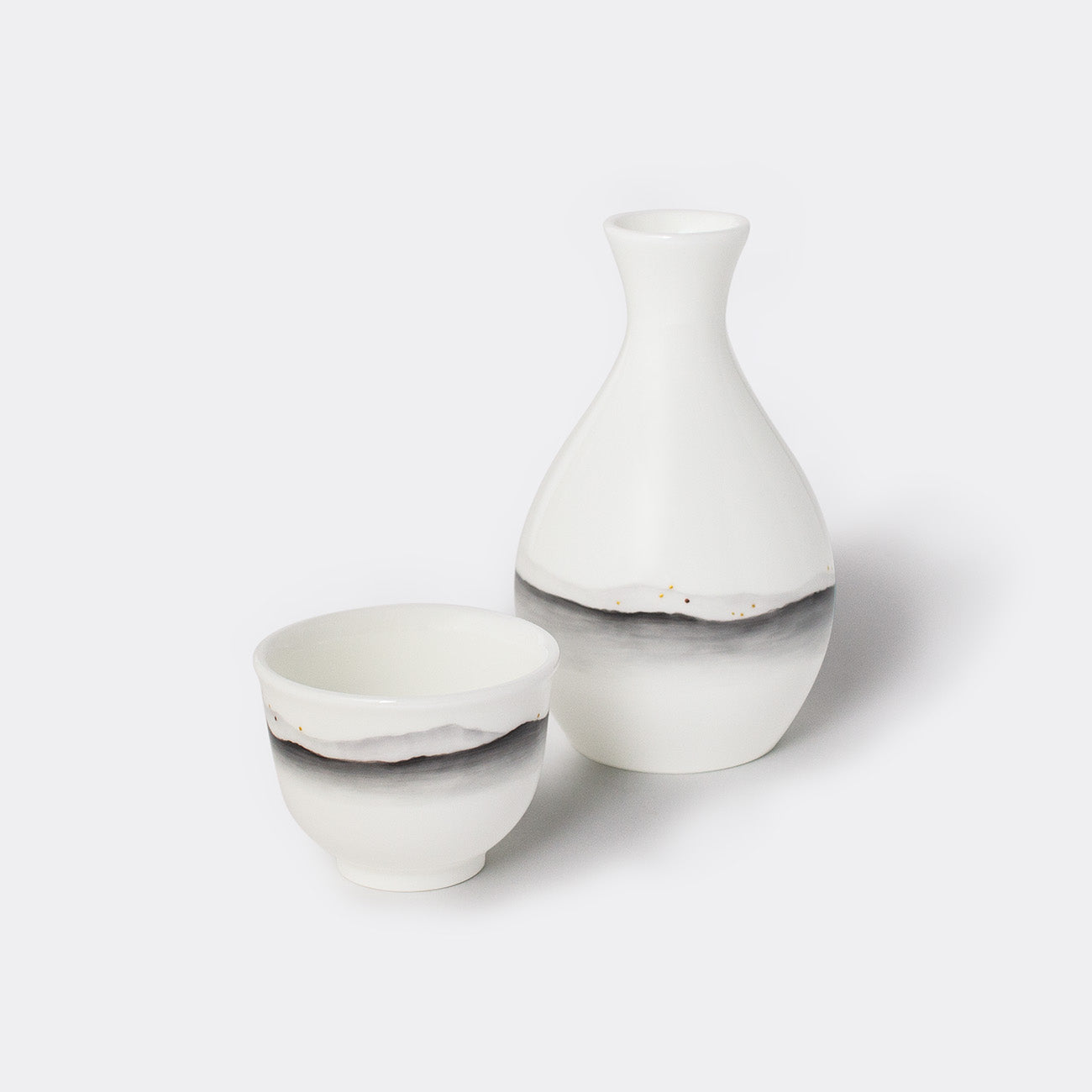 北陸の自然をテーマに墨絵調で描いた酒器セット「山ぎわ」はしっとりと落ち着いた中にモダンな雰囲気を感じさせる器です。大切な方への贈り物にもおすすめです。セット内容:
