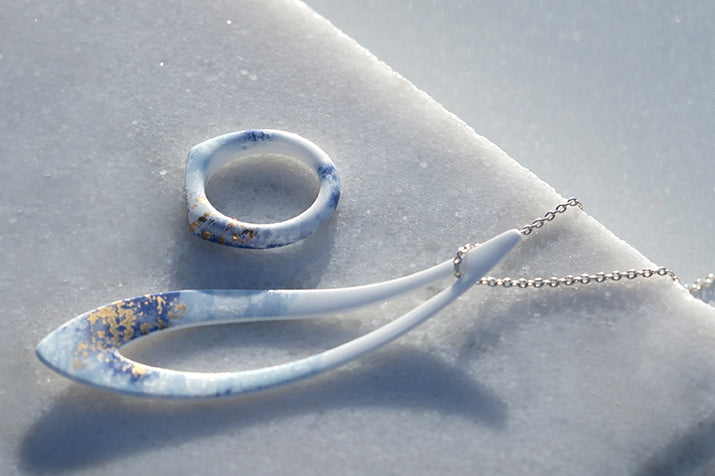 つるりとした質感と優しい肌当たりが心地よいセラミック(アルミナ)製のバングルです。金属アレルギーのある方でも安心してお使いいただけます。純白の素地に映える鮮やかで抽象的なアーティスティックパターンは腕の所作によりきらりと光る金が更に華やかさを増します。