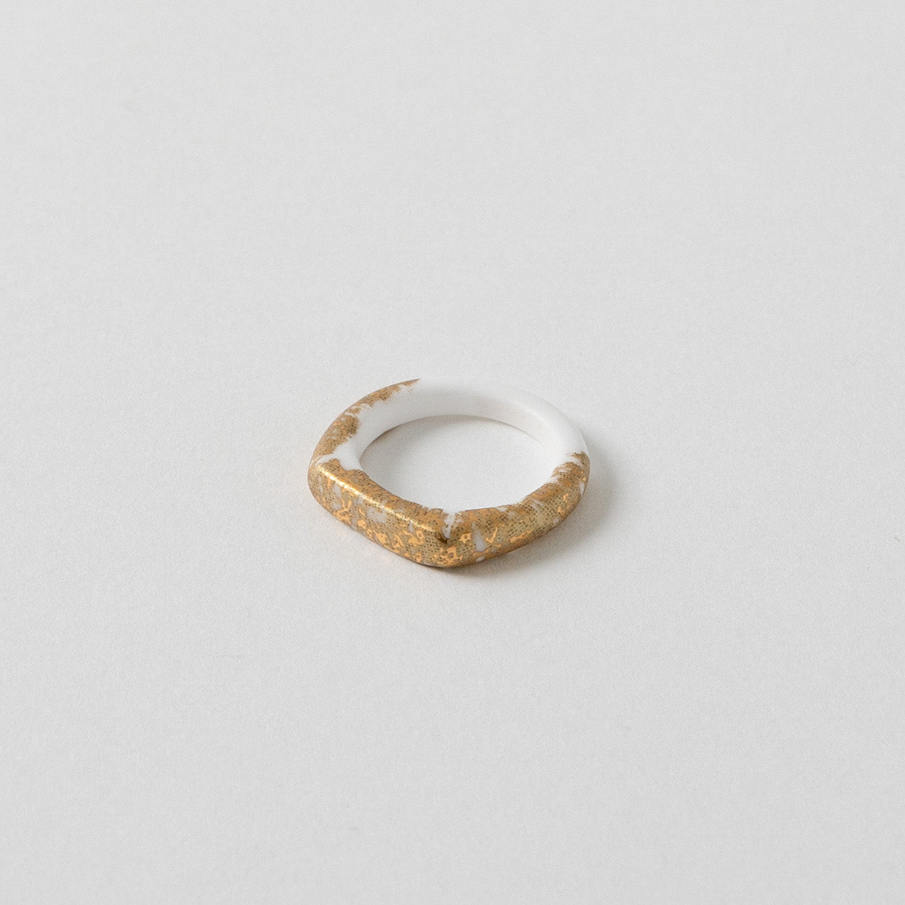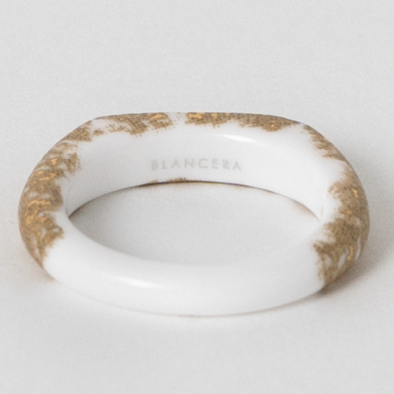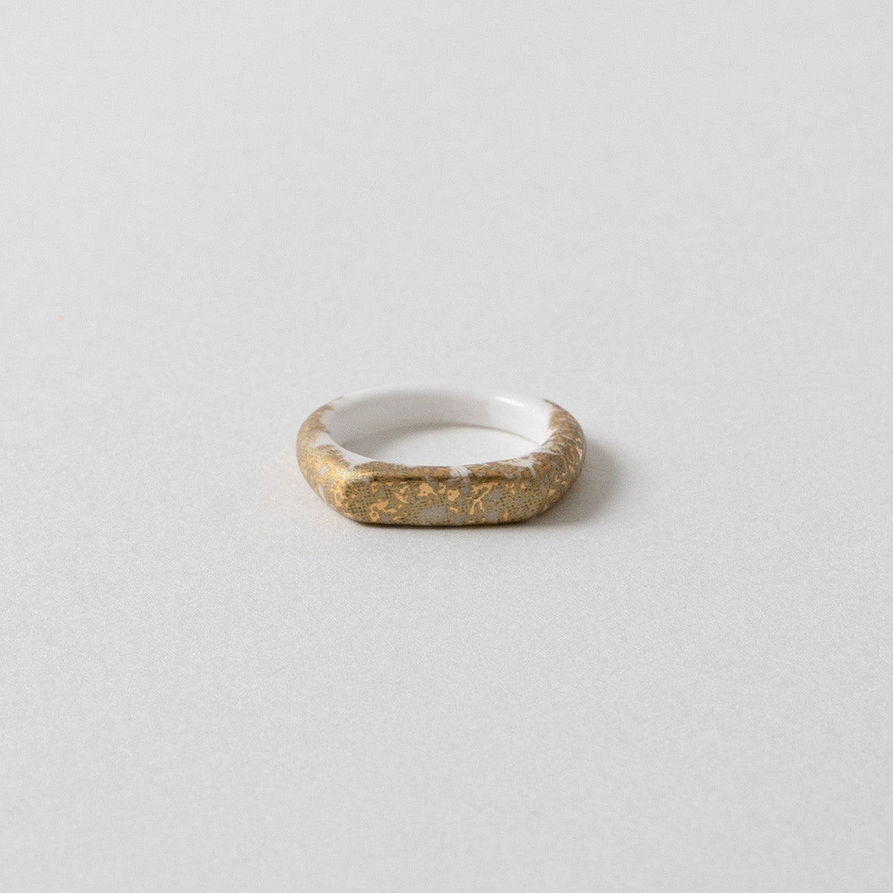 つるりとした質感と優しい肌当たりが心地よいセラミック(アルミナ)製のリングです。金属アレルギーのある方でも安心してお使いいただけます。金沢金箔をモチーフにしたデザイン。真っ白のアルミナ素地に金と偏光マイカ金が美しく輝きます。