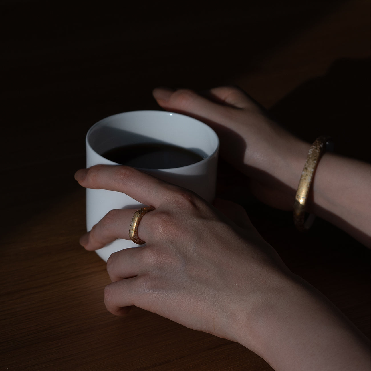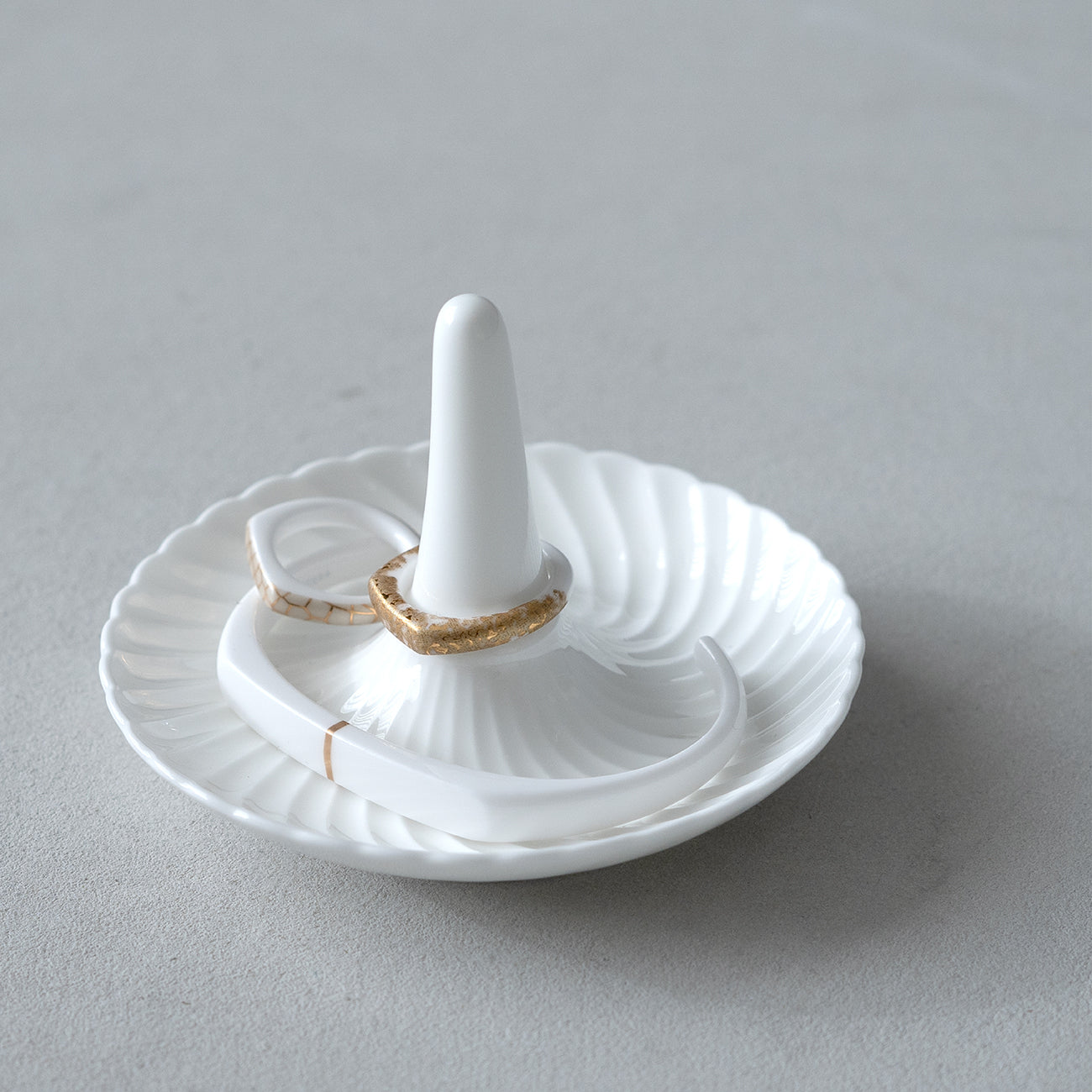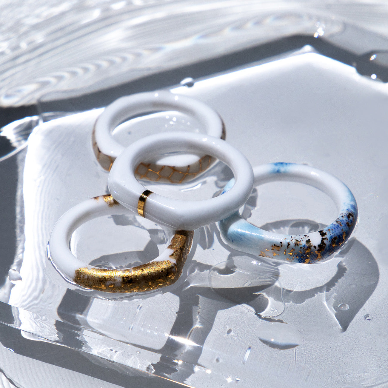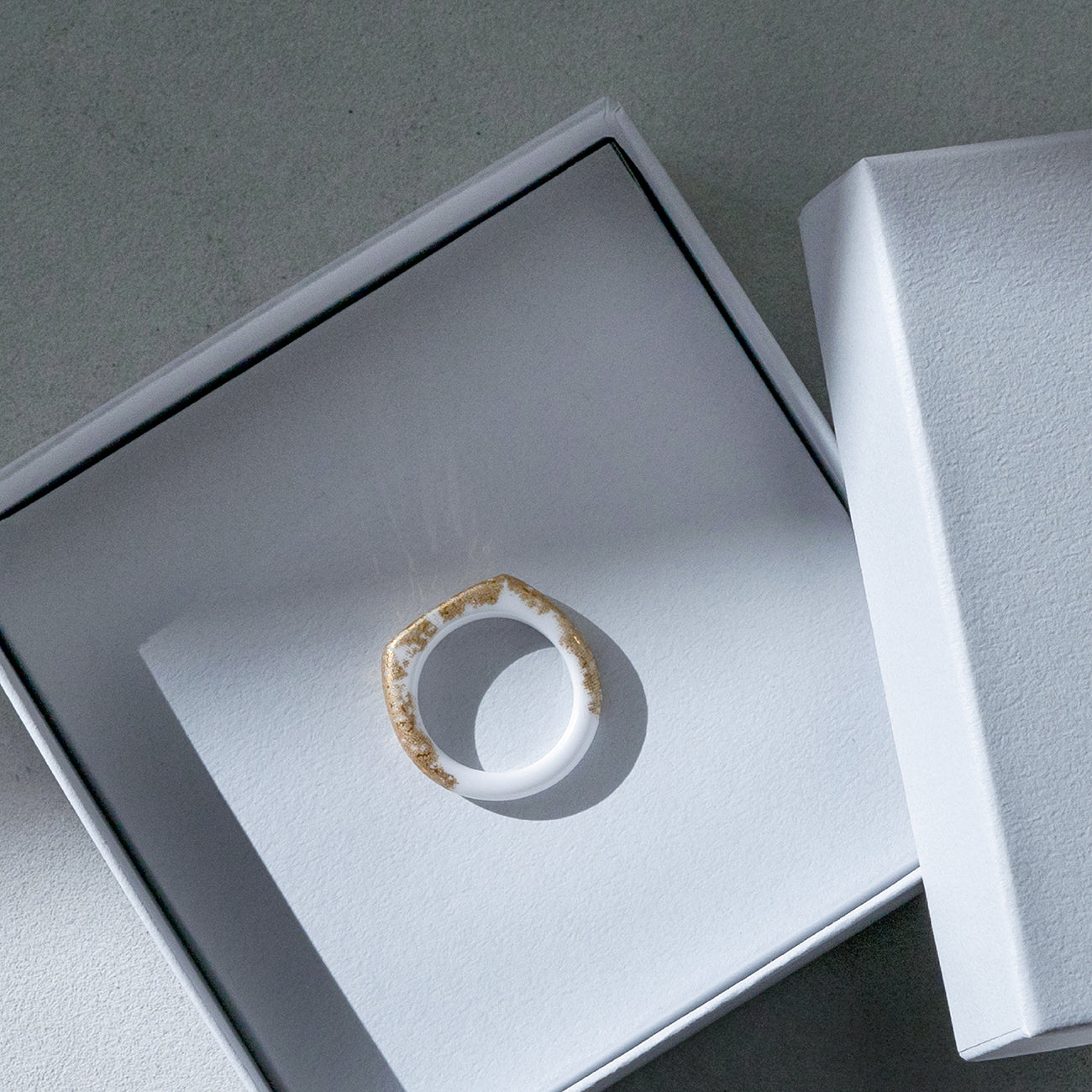 つるりとした質感と優しい肌当たりが心地よいセラミック(アルミナ)製のリングです。金属アレルギーのある方でも安心してお使いいただけます。金沢金箔をモチーフにしたデザイン。真っ白のアルミナ素地に金と偏光マイカ金が美しく輝きます。