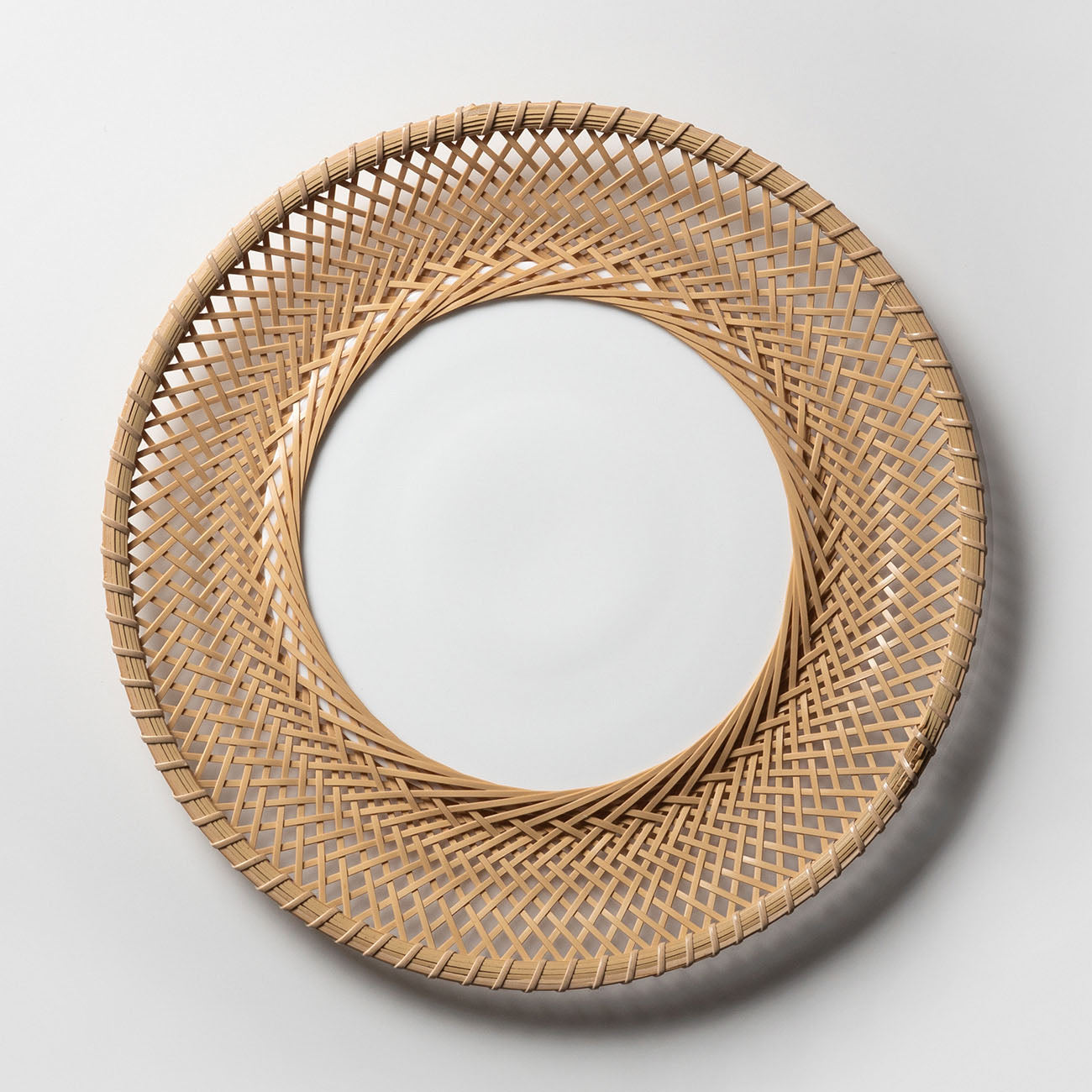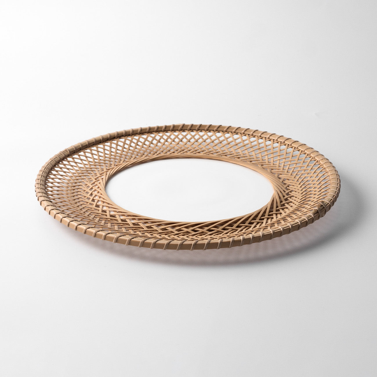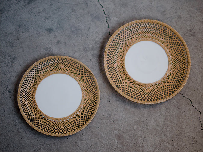 このプロダクトのために新たに設計されたほぼフラットな17cmプレートに竹工芸の技法の一つである輪弧編(りんこあみ)で竹を編み込んだ27cmプレートです。おもてなし用のメインプレートやショープレート、飾り皿、お花を飾ったインテリアのアクセントなど幅広くお使いいただけるアイテムです。