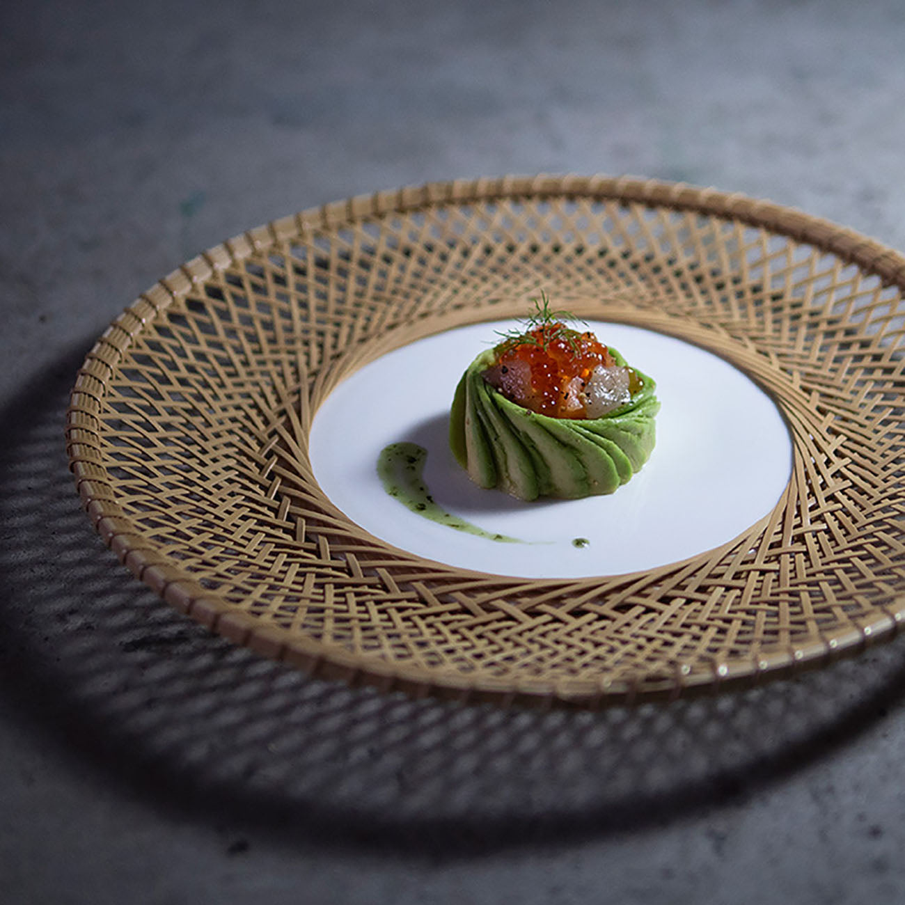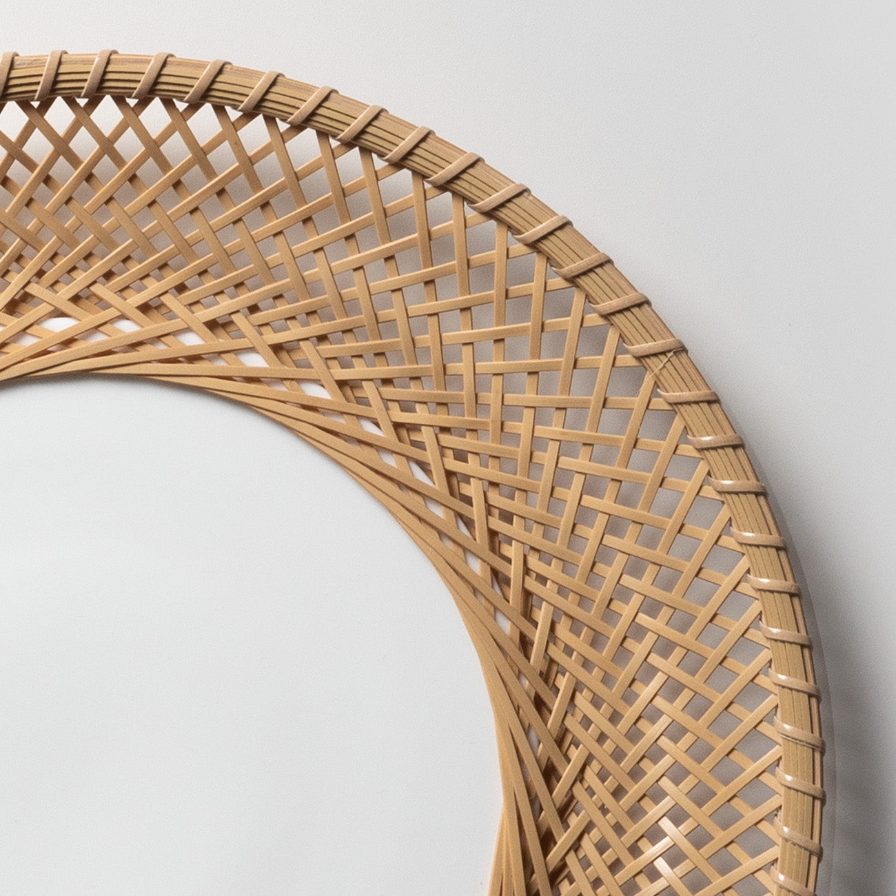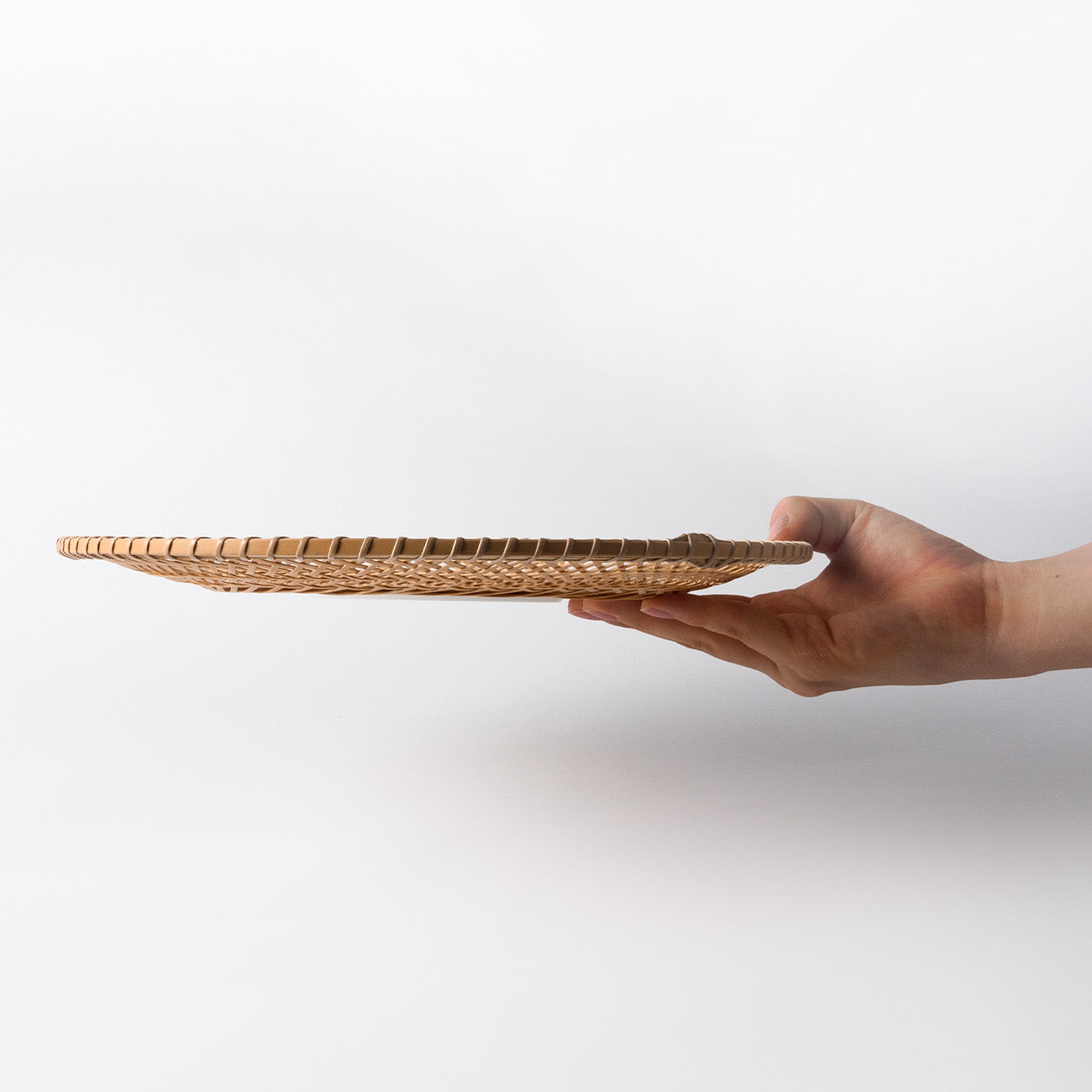 このプロダクトのために新たに設計されたほぼフラットな17cmプレートに竹工芸の技法の一つである輪弧編(りんこあみ)で竹を編み込んだ27cmプレートです。おもてなし用のメインプレートやショープレート、飾り皿、お花を飾ったインテリアのアクセントなど幅広くお使いいただけるアイテムです。