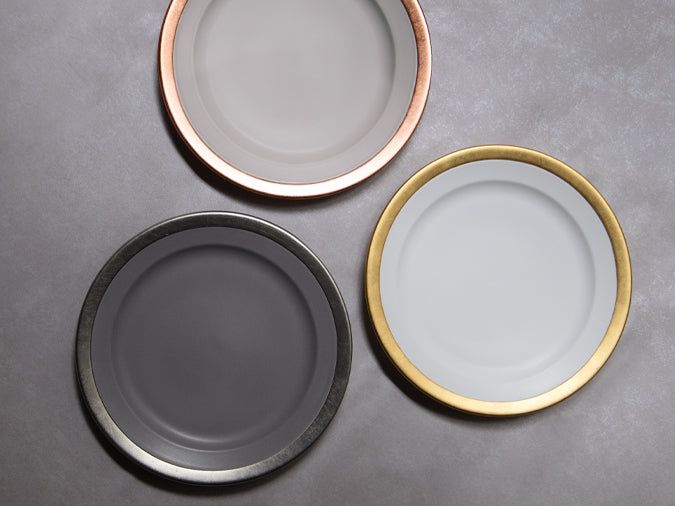 このプロダクトに合わせて専用に開発された26cmプレートをベースにし、縁に錫を組み合わせた27cmプレートです。錫の上から金箔の加工を施しています。スタンダードなリムプレート形状なのでディナーなどのメインプレートとし幅広くご使用いただけます。