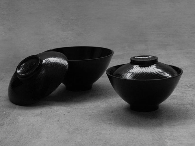 柳宗理によって1950年代にデザインされた漆椀にフタのつまみなど細かな改良を加え復刻した「柳漆椀」。